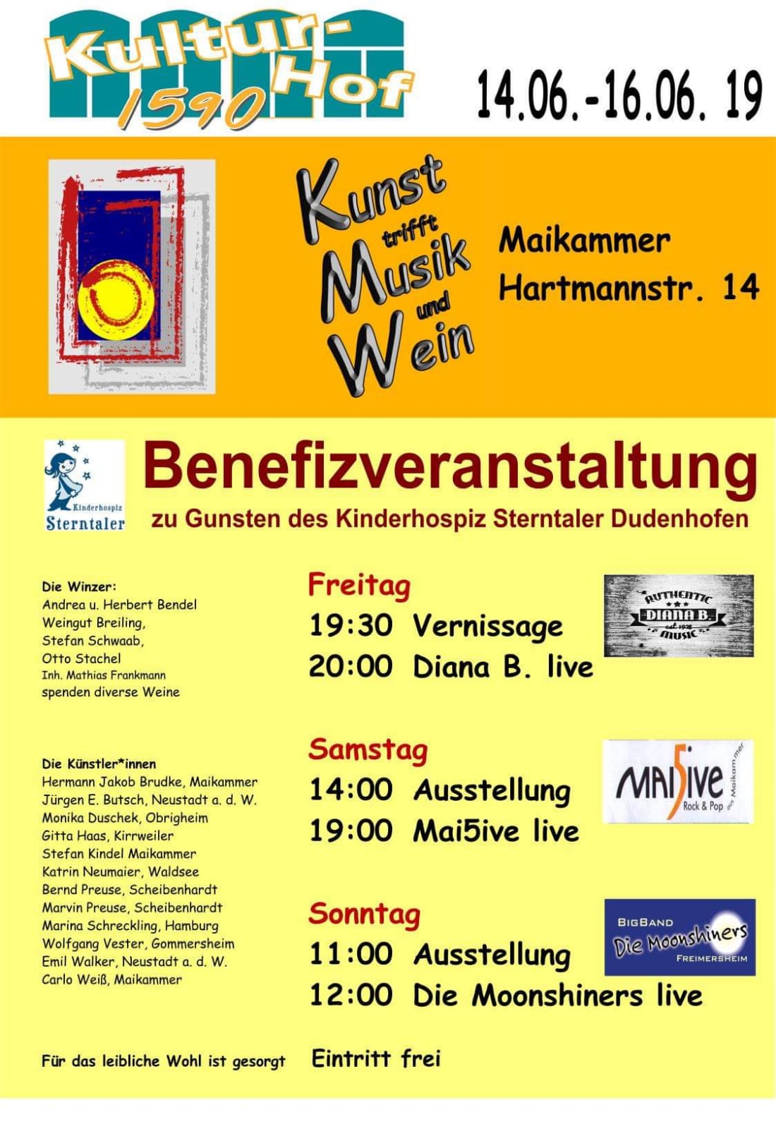 Zu Gunsten des Kinderhospizes Sterntaler in Dudenhofen organisiert Hermann Brudke (www.hermann-brudke.de) im Kulturhof 1590 in Maikammer eine Ausstellung mit vielen tollen und vielseitigen Künstlern. 2019 nehme ich zum vierten Mal daran Teil.